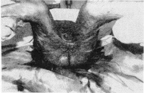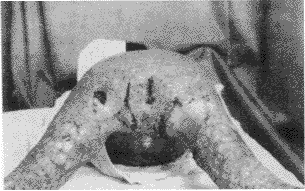 3.外生殖器官功能障碍型: 多为会阴部深度烧伤或电烧伤所致。轻者仅有阴茎移位、短缩、女性大小阴唇移位变形等。重者外生殖器被增生瘢痕包埋,睾丸缺失或隐睾(见图7.8),尿道及阴道口被瘢痕遮挡,排尿及月经不畅,性生活功能障碍。治疗原则:轻者经瘢痕松解后,利用周围正常皮肤即可修复;重者需行髂腹股沟皮瓣、下腹部岛状皮瓣,大腿内侧皮瓣或全厚皮片修复。