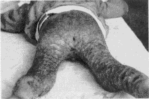 5.复合功能障碍型: 既有外展、下蹲功能障碍体征,又有外生殖器、肛门功能障碍的表现,或畸形涉及三种以上功能障碍者(见图7、8),治疗原则:一般分二期治疗,先解决外展及下蹲功能障碍和肛门狭窄,再进行外生殖器官的修复与再造,条件允许者亦可Ⅰ期修复。