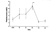 (二) 肺灌洗液中PMN呼吸爆发的改变(图4)伤后2h PMN呼吸爆发即显著升高(与对照相比,P<0.05),8h达到峰值,12h已恢复到伤前水平,随后虽有上升趋势,但至24h与对照相比无显著差异。