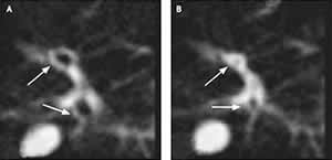 1例61岁的老年男性自诉有进行性呼吸困难12年,诊断为慢性阻塞性肺疾病(COPD),有吸烟史(150包/年)。X线胸片显示肺气肿,1秒钟用力呼气量为0.72 L(为预期值的28.8%)。胸部高速电子束CT扫描显示小气道(直径约3 mm)在吸气时开放(图A箭头处),但在呼气时极度狭窄(图B箭头处)。