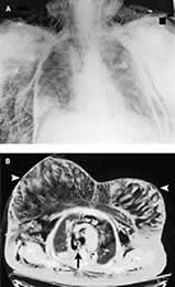 1例77岁妇女接受T12至S1椎板切除术和后脊柱融合术,手术取俯卧位,手术结束后改为仰卧位,送入重症监护病房,此时病人气道压力快速升高,出现大块皮下气肿和低氧血症。胸部X线显示有皮下气肿,但无明显气胸(图A)。放置双侧胸导管但病人的低氧血症无改善。CT扫描显示有大量皮下气肿(图B),并确认在气管隆突上2 cm(箭头)有一气管穿孔,与纵隔积气和气胸相关。推测此气管穿孔由气管插管所致,它易于发生在从俯卧位变为仰卧位时。病人随后接受了胸廓切开术,修复气管损伤,此后病人康复。