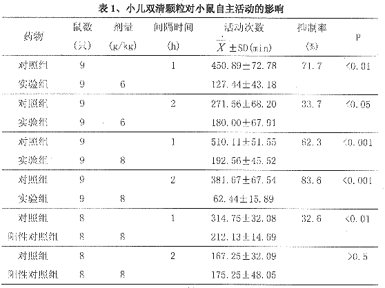 由表1可见,口服小儿双清颗粒8g/kg,可非常明显地减少小鼠的自主活动度(P<0.001),作用持续2小时以上,剂量减为6 g/kg,给药后1小时比2小时作用明显,而阳性对照组8g/kg给药1小时作明显,2小时则无作用。