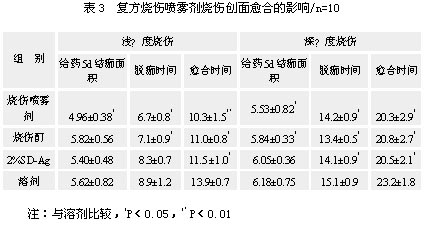 实验结果见表3,表明复方烧伤喷雾剂可明显促进烧伤创面的 愈合,与2%SD-Ag效果相似