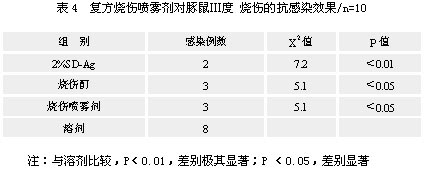 绿脓假单胞菌经 16~24h的培养,用生理盐水制成4×108的细菌悬液,取1ml涂布于Ⅲ度豚鼠烧伤创面模型 (燃烧19s)上,按以上给药方法给药。实验结果,每组10只Ⅲ度豚鼠烧伤创面模型中,2%SD- Ag、烧伤酊、复方烧伤喷雾剂对豚鼠Ⅲ度烧伤的抗感染作用非常显著,三者之间则 无显著差别,见表4。