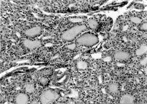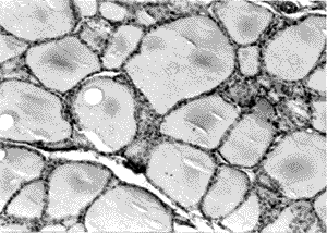甲状腺病理检查结果:1)瘿消颗粒剂大剂量组,以中等甲状腺滤泡为主,其上皮细胞多为扁平状,极少数为矮立方形,胶质储留。2)中剂量组,以中、小甲状腺滤泡为主,其上皮细胞多为矮立方形,极少数为立方形,胶质中等。3)小剂量组,以小或中等的甲状腺滤泡为主,其上皮细胞多为立方形或矮立方形,胶质较少,可见少数吸收空泡。4)生理盐水组,以中、小甲状腺滤泡为主,其上皮细胞为立方形,少数为矮立方形,胶质较少,偶见吸收空泡。5)他巴唑组,以中、小甲状腺滤泡为主,其上皮细胞为立方形或短立方形,胶质较少见。