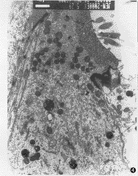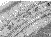 3.耳蜗铺片及透射电镜所见:耳蜗铺片显示GM组用药后3排外毛细胞损伤明显比GM+DFO组重(图2,3),且从顶回至底回逐渐加重,外毛细胞损伤较内毛细胞重。透射电镜见GM组耳蜗毛细胞胞浆细胞器减少,呈空泡变性(图4);GM+DFO组则显示损伤较轻,线粒体完整,出现一些多泡体结构(图5)。GM组还可见耳蜗传入神经突触线粒体空化,血管纹边缘细胞突起中的少数线粒体亦出现嵴减少、空化。DFO组与对照组用药前后耳蜗铺片及透射电镜改变不明显。