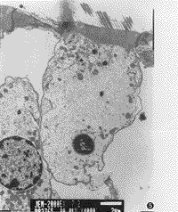 图4 透射电镜观察GM组毛细胞胞浆稀疏呈空泡变性,胞核浓缩。×6000
