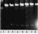 1.DNA/Hind ;8.control plasnid pBS-KS;2~7.restriction products of reconbinants(insertsrange fron 500bp(lane6,7)to 200bp(lane2,5)