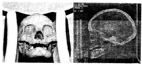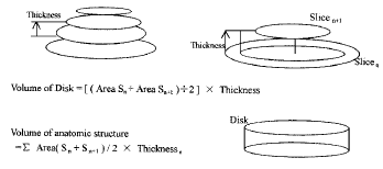 使用SIEMENS公司生产SOMATOM ARTCT扫描机,将头颅标本逐个安置固定于扫描机固位头架上,使眶耳平面(Frankfortplane)和正中矢状面垂直于地平面(图2)。依照标准方法扫描[5] :扫描基准线平行于眶耳平面,设置骨窗,行层厚2mm、连续不重叠、轴向断层扫描,获取分辨率512×512矩阵CT断层影像,由图像工作站将其重建为颅面三维影像(图3)。CT影像由作者所建颅面外科三维诊断分析和手术设计系统(3-DCMFCADS)的MUSTEK图像扫描仪数字化转换输入DIGITALVENTURIS FP-5100计算机,以600DPI分辨率数字化图像存储。可根据诊断治疗需要随时调用图像,运行作者设计编制的测量软件进行颅面CT影像三维测量,测量项目与直接测量项目逐一对应,包括线距、角度、解剖结构的面积和体积。其中面积和体积的运算需要先对感兴趣部位进行图像编辑、灰度均一化、配准处理,面积采用像素求和法获得,三维结构体积算法原理如图4所示,其数学模型为Volume=Σarea(Slicen +Slicen+1 /2)×Thickness