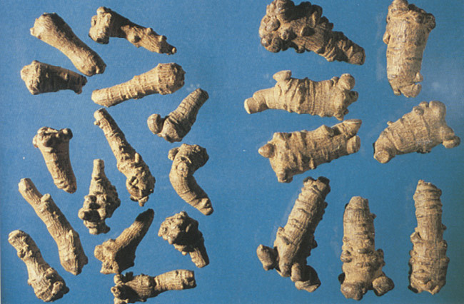 为五加科多年生草本植物三七Panax notoginseng (Burk.) F. H. Chen 的干燥跟。主产于云南、广西。多为栽培品。秋季开花前采挖,晒干,生用。