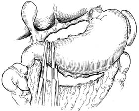 | ⑸切断十二指肠,翻起胃体,再切断胃左动脉 |