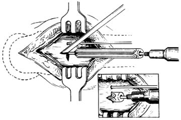6.钉入三翼钉 三翼钉的长度应选择其顶端位于关节面下,其尾部恰好紧嵌在股骨外侧皮质骨内为最合适。首先以导针为中心,在股骨上凿除一些皮质骨,使与钉的三翼相对应,以免钉裂骨质,并可避免因皮质骨的阻力而改变钉入方向。将三翼钉套入导针,用钉入器在导针之外,旋入固定在三翼钉尾部,顺导针方向逐渐钉入[图2 ⑽]。捶击方向应与导针方向一致,捶击力要轻要稳。捶击时在股骨头部位应嘱助手用手掌适当向后加压,以防止头部旋转。三翼钉每进1cm就应测量一次导针在骨外的长度,在正常情况下,骨外长度应保持恒定。当三翼钉尾部进入皮质骨时,应当凿除与尾部对应的皮质骨,使尾部紧嵌在骨内,又不发生劈裂骨折,以增强固定效果。然后,用嵌插器在大转子部捶击数下,消除进钉时可能引起的骨折端的裂隙,使骨折端紧密相嵌[图2 ⑾]。再次摄正、侧位X线片,检查三翼钉位置,用拔出器或钉入器调整至理想深度[图2 ⑿]。最后,拔出两根导针,冲洗伤口,逐层缝合。