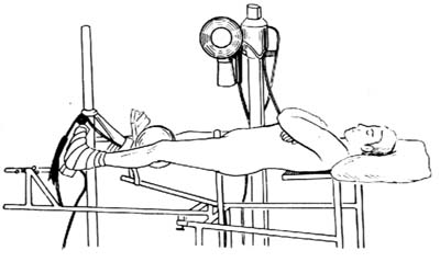 定位主要是定导针插入的上下方向。前后方向一般保持在水平位进针即可,因为伤肢内旋,大转子、股骨颈与头部已呈水平位。但仍需按X线侧位片显示的导针位置,进行校正。