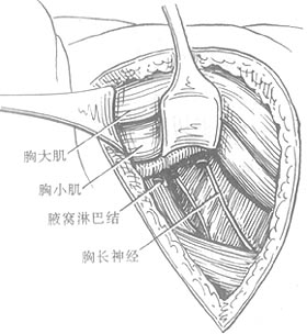 手术切口及皮瓣游离范围与乳癌根治术相同。从乳房上方延及胸骨旁,腹直肌上端,乳房外侧缘腋窝用电刀沿胸大肌筋膜,将整块乳房和脂肪组织切除。将大血管结扎止血,小出血点用电凝止血。然后剪开腋筋膜并分离该处胸大肌缘到腋顶部,将胸大肌和胸小肌向内上方拉开。显露腋窝,用锐剪刀从腋顶部开始,沿着腋静脉小心细致地向下分离脂肪组织和淋巴结。注意保护腋静脉、胸长神经和胸背神经。最后清除中央淋巴结、腋静脉淋巴结胸大肌内侧淋巴结和肩胛下淋巴结。如果触及锁骨下可疑转移淋巴结,应同时切断胸大、小肌,使其翻转向下,细致小心分离锁骨下淋巴结和脂肪组织,操作与乳癌根治术相同。然后冲洗,吻合胸大肌。胸小肌不需吻合。放好引流,加压包扎伤口。如果锁肌下无可疑转移淋巴结,则勿需切断胸大、小肌[图1]。