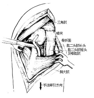 | ⑴在牵引下,用骨膜剥离器撬拨复位 |