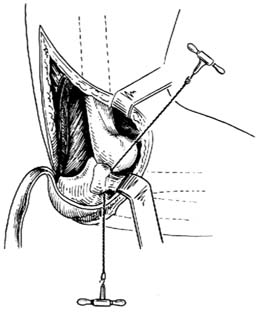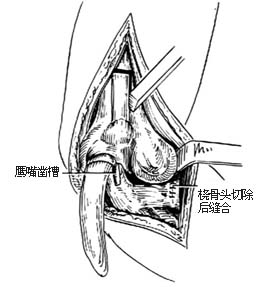 | ⑴脱位肘关节,显露两端关节面,并切除骨面直达松质骨面 |
