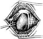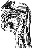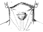 在胚胎发育过程中,甲状腺的胚基在咽腔底部,最先是一个凹陷,以后向下延伸成一袋状突起,然后紧贴或穿过舌骨直达甲状软骨下方,形成甲状腺。正常情况下,当胚胎发育至6-7周时,此袋状突起应萎缩消失,仅在其舌根部的起点遗有残迹即舌盲孔。如袋状突起未闭合,就会在舌骨与甲状软骨间形成囊肿或瘘管(图1)。