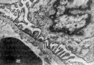 电镜下见驼峰状沉积物位于毛细血管基底膜表面。沉积物表面有上皮细胞覆盖,上皮细胞足突消失 ×16000