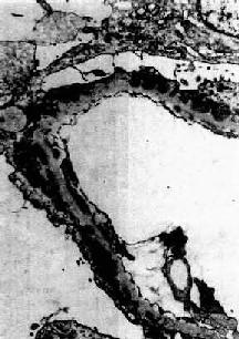 Ⅱ型肾小球毛细血管基底膜不规则增厚。在基底膜致密层内有高电子密度的粗大呈带状的沉积物(图12-16)。故这型肾炎又称为致密沉积物性肾小球肾炎或致密沉积物病。