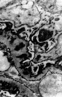 电镜观察可见肾小球系膜增生,毛细血管基底膜不规则增厚。增生的系膜组织沿毛细血管基底膜和内皮细胞之间向毛细血管周围部分伸展,甚至环绕全部毛细血管壁,使毛细血管壁增厚。肾小球内有大量电子致密物沉积。根据沉积物的部位,可将膜性增生性肾小球肾炎分为3型: