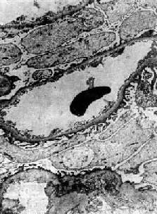 电镜下,可见肾小球毛细血管基底膜不规则增厚,部分变薄,有时在基底膜上、膜内或膜下可见电子密度高的沉积物。在增生上皮细胞形成的新月体内,可见纤维蛋白条索。有时可见肾小球毛细血管基底膜有裂孔或缺损。血液内的红细胞和纤维蛋白原可通过这些缺损进入肾球囊,促使肾小球上皮细胞增生。