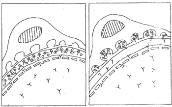 可形成肾小球植入抗原的非肾小球抗原可为内源性或外源性。例如带正电荷的非肾小球抗原或抗体,可与肾小球内带负电荷的成分如基底膜表面的硫酸类肝素、多糖蛋白或系膜细胞表面的阴离子结合形成植入抗原。免疫球蛋白,聚合的IgG等大分子物质常在系膜内沉积与系膜结合形成植入抗原。此外,细菌的产物如甲组链球菌产生的endostreptosin、病毒、寄生虫等感染产物和某些药物都可能与肾小球内的成分结合形成植入抗原。大多数植入抗原引起的肾小球肾炎,用免疫荧光法检查可见免疫复合物在肾小球内呈不连续的颗粒状荧光(图12-3右)。