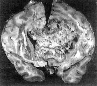 在两半球内肿瘤呈蝴蝶状,边界不清,切面见有出血、坏死及液化