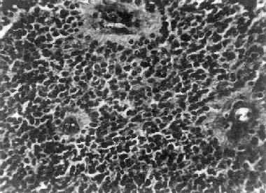 肉眼观,瘤组织呈鱼肉状,色灰红。镜下,肿瘤由圆形、椭圆形或胡萝卜形细胞构成,胞核着色深,胞浆少而边界不清楚,有多少不等的核分裂像。细胞密集,间质中有纤细的纤维,血管不多。瘤细胞环绕一个嗜银性纤细的神经纤维中心作放射状排列形成典型的菊形团(图16-26),这对髓母细胞瘤的病理诊断有一定的意义。瘤细胞具有向神经元及神经胶质双向分化的潜能,既能向神经母细胞、节神经细胞分化,也能向胶质母细胞、星形胶质细胞分化。如瘤细胞侵入软脑膜,可在蛛网膜下腔脑脊液中广泛播散转移。