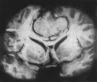 肉眼观,肿瘤为数厘米的结节至巨大块状。分化较好的肿瘤,境界不清;而分化程度较低的肿瘤则境界分明。瘤体灰白色。质地视肿瘤内胶质纤维多少而异,或硬、或软、或呈胶冻状外观,并可形成大小不等的囊腔。由于肿瘤的生长、占位和邻近脑细胞的肿胀,脑的原有结构因受挤压而扭曲变形(图16-23)。