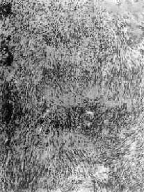 (3)过度(混合)型:脑膜细胞与纤维细胞混合,排列成分叶状,中央为脑膜细胞,周围为纤维细胞,常形成旋涡状结构(图16-28),其中常包含有同心层状结构的砂粒体,乃变性肿瘤细胞及钙盐沉积。肿瘤质地硬,似砂砾状。
