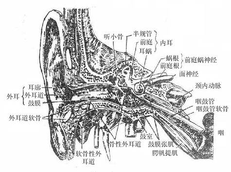 咽鼓管auditorytube 由咽侧壁向后外通向鼓室,长约4厘米,可分为内侧的软骨部和外侧的骨部(即颞骨岩部的咽鼓管半管)。骨部的外侧端开口于鼓室的前壁,软骨部的侧端开口于鼻咽部的侧壁,约与下鼻甲的后端平齐,叫做咽鼓管咽口。当吞噬时,咽鼓管咽口张开,使空气经咽鼓管至鼓室,以维持鼓膜内、外的大气压的均衡,便于鼓膜接受声波冲击而颤动。小儿咽鼓管短且走向平,腔径较大,故咽部感染常经咽鼓管向鼓室蔓延。
