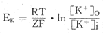(1)式中Ek表示K+平衡电位,R是通用气体常数,Z是离子价,F是Farady常数,T是绝对温度;式中只有[K+]o和[K+]i是变数,分别代表膜两侧的K+浓度。如果把有关数值代入,室温以27°С计算,再把自然对数化为常用对数,则式(1)可简化为;(2)