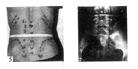 图5 直角髂嵴 图6直角髂嵴X线正位片(髂嵴后1/4部垂直升至L4椎体上缘,呈直角转向前外方与后正中线距离仅4.5cm