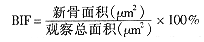 2.3.2 定量组织学分析 新骨生长率(bone ingrowth fraction, BIF)测定:每张切片在光镜×10倍条件下,取种植体穿皮质骨、松质骨和位于髓腔内的种植体下端三个部位的两侧界面,共6个视野。对每个所取视野照相,通过VIDAS系统使图像扩大转现在屏幕上。每个视野的观察总面积固定为距界面同一宽度(约150 μm)的范围内,通过电脑自动识别在这一范围内已标记荧光的新骨组织,并用相应的程序测量新骨面积和观察总面积。将6个视野的新骨面积与观察总面积分别相加,按下式计算BIF,结果见表2。经统计学处理,P<0.05,复合FDBM侧优于对照侧,有显著性差异。