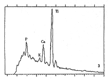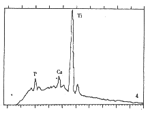 图3 TA0FDBM-骨组织界面(30天)Ca、P、Ti元素峰(扫描电镜-能谱分析) 图4 未复合FDBM侧30天时界面的Ca、P、Ti峰(SEM-EDA分析) 图5 TA0-骨组织界面(180天)Ca、P、Ti元素峰(扫描电镜-能谱分析)