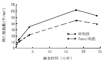 图4 两种方法在相同时间点的脑皮质凋亡细胞数比较