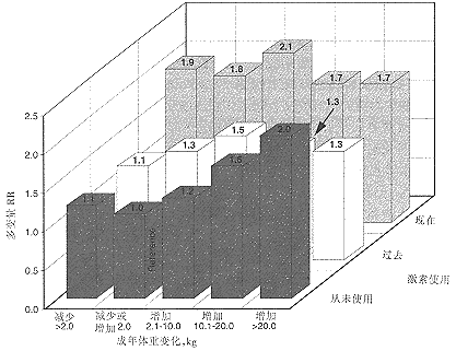 在从未用过激素的人群中,体重增加与绝经后乳腺癌的发病率具有很强的正相关关系(附图)。在未用过激素的人群中,与体重无明显变化者相比,体重增加10~20 kg的多变量相对危险为1.61(95%CI,1.16~2.22),体重增加20kg以上的相对危险为1.99(95%CI 1.43~2.76)。但是在过去以及现在使用激素治疗的人群,体重增加并不提高乳腺癌的危险。体重变化与绝经后激素治疗间的相互作用有统计学显著性(P<0.001, 2df)。