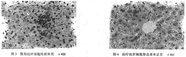 正常组小鼠肝小叶清晰,界板整齐,肝索呈放射状排列,肝细胞多边形,胞浆丰富呈圆形或近圆形(见图1),中央静脉居中,汇管区三联结构完整。模型组肝小叶尚可辨认,但肝索紊乱,肝细胞弥漫脂肪变性,尤以中央静脉周围区为著,并见空泡变性,气球样变,部分细胞内含嗜伊红鹿角状团块,考虑为Mallory小体,部分细胞胞浆内含粗大颗粒,为膨胀线粒体。点状、灶状坏死易见,其中见中性粒细胞浸润。界板尚无明显破坏(见图2,图3)。肝窦相对正常组肝组织缩小,枯否氏细胞增生,部分中央静脉周围可见纤维增生。汇管区多略见扩大,并有中性粒细胞和淋巴细胞浸润。治疗组8例中除3例肝细胞轻度浊肿外,余皆正常(见图4)。