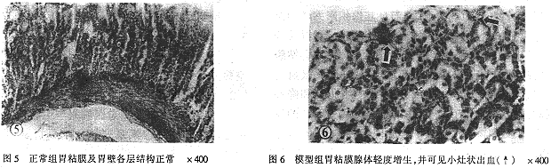 正常组小鼠胃壁结构正常,粘膜上皮单层柱状,核位于基底。固有层腺体管状或分枝状,无炎细胞浸润(见图5)。模型组胃粘膜充血水肿,胃粘膜腺体轻度增生,部分区域糜烂,并可见小灶状出血(见图6);治疗组胃粘膜除2例轻度充血水肿外,余皆无明显变化,而同正常组相应胃粘膜之形态结构。
