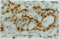 图2 原发性胆管癌低分化腺癌组织P53过表达(SP免疫组化染色).×400