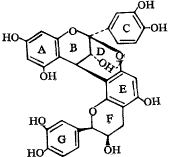 化合物Ⅳ:无色针晶(95%乙醇-水),mp 235℃~236℃,〔a〕20D+55.8°(MeOH)FABMS给出577(M++H),结合1H、13CNMR数据,确定其分子式为C30H24O12。IR(KBr)cm-1:3 406示有OH存在;1 625,1 510,1 486为芳环的特征吸收。考察Ⅳ的 13 CNMR,计算分子的不饱和度,提示该化合物含有4个芳环和3个脂环。1HNMR(500 MHz,C5D5N) ppm:δ4.05(1 H,d,J=3.66 Hz),4.41(1 H,d,J=3.36 Hz)为B环3,4位质子信号;δ4.93(1 H,s),4.24(1 H,m)和δ2.74(1 H,dd,J=17.09,2.14 Hz)、2.92(1 H,dd,J=16.78,4.58 Hz)分别为F环2,3和4位质子信号;δ6.00(1 H,d,J=2.44 Hz),6.06(1 H,d,J=2.45 Hz)归属于A环6,8位质子;6.09(1 H,s)为E环6位质子信号;δ7.13(1 H,d,J=2.14 Hz),δ7.15(1 H,d,J=2.14 Hz)为C环和G环2位2个质子信号;δ6.797(1 H,d,J=8.2 Hz),δ6.80(1 H,d,J=7.9 Hz)为C环和G环5位2个质子信号;δ6.97(1H,dd,J=8.5,2.1 Hz),δ7.01(1 H,dd,J=8.5,2.4 Hz)为C环和G环6位2个质子信号。13CNMR数据见表1。根据Ⅳ的理化性质和光谱数据,并参考文献〔3〕,确定该化合物为原花色素A2其结构见图1。