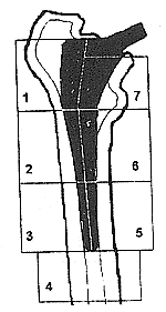 测量时病人仰卧,双下肢旋转程度相同,保证髌骨位于中立位,由股骨远端向近端扫描。分析时采用Gruen's 7区法,测定股骨假体柄上缘内侧至假体柄尾的长度,输入计算机,机器自动将假体柄等分为三等份,将假体周围骨质分为内侧的7、6、5区和外侧的1、2、3区,再加上假体柄尾端的4区共7个区(图1)。患者对侧股骨被作为对照。Orthopadedics软件能自动模拟假体覆盖于对侧股骨的同一部位,同时该软件还可以排除假体周围骨水泥对测量结果的干扰,便于对照。