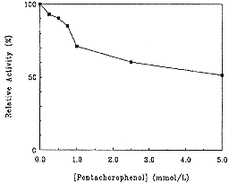 图2 不同浓度五氯酚溶液中人PLAP的活力变化。酶浓度0.36 μg/ml,测定温度25 ℃