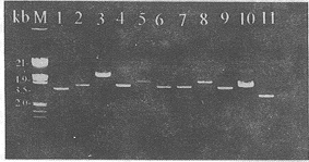 1-10:HindⅢ酶切的白斑质粒;11:HindⅢ酶切的SK。