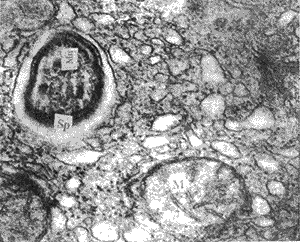 , http://www.100md.com     图1 对照组肝细胞内线粒体(M),纳虫泡内Sp结构完整,内含微线体(Mn)30000×