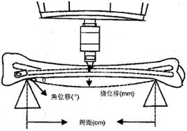 2.实验方法:12对24根标本分两组,按同一人体左右侧行自身对照,用钢锯锯成胫骨中段标准横行骨折,骨折间隙2mm。右侧行RIN钉固定,左侧行Ender钉固定。第一步,扭转试验:随机取其中6对标本,两端以聚乙树脂浇铸,自制夹具夹持。置于K-50型扭转试验机上,按胫骨的内旋与外旋两个方向匀速加载,每1°记录变形值,共测15°。每一方向测量3次,平均值作为该方向的扭转变形值,再将其换算为扭矩值(本实验中1N*m=400变形值)。测试过程中保持试件完整。描绘扭矩-扭角曲线,t检验分析并计算扭转刚度。第二步,弯曲试验(图1):其余6对标本置于Instron万能液压试验机上,跨距定为20cm,按内→外、外→内、前→后、后→前4个方向行三点弯曲试验。每一方向测3次,最大弯曲变形达13cm时即停止试验,同一方向上的弯曲负载、桡位移3次平均值作为该方向上的弯曲负载、桡位移最终数据,将其换算为负载-角位移值[角位移(°)=arctg(桡位移)/(跨距)]。据此值描绘弯曲负载-位移曲线,t检验并分别计算弯曲刚度。