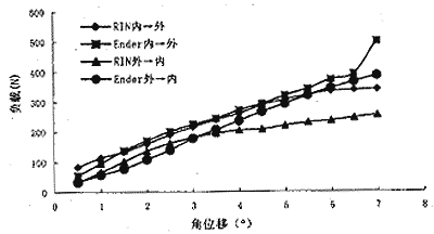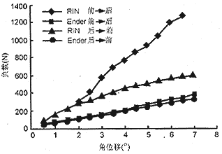 均较Ender钉大,二组比较有显著性差异(χ2,P<0.01)。见图4。前→后弯曲刚度RIN钉为205.40 N.m/度,Ender钉为50.40 N.m/度,前者为后者的4倍;后→前弯曲刚度RIN钉为77.96 N.m/度,Ender钉为45.35 N.m/度,前者为后者的1.7倍。