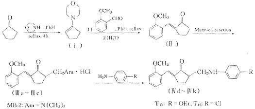 过去的研究已证实癌症与炎症在病理上和生化代谢上有着密切的联系,而且都与花生四烯酸的代谢有关.某些抑制花生四烯酸环氧酶代谢途径的非甾体抗炎药具有抗癌活性,而一些抗癌药也可用于治疗类风湿性关节炎〔1~4〕;近年来发现环氧酶存在COX-1及COX-2两种不同形式,并认为抑制COX-2活性可能是治疗慢性炎症和防治癌症的共同生化基础〔5~7〕.曾报道环戊酮Mannich碱类化合物具有抗癌、抗炎活性〔8~11〕,最近又发现这类化合物能选择性地抑制炎症部位前列腺素的合成而不影响胃粘膜中的前列腺素的合成〔12〕,显示了选择性COX-2抑制剂的作用特点.为进一步研究这类化合物的生理活性和构效关系,本文以具有较强抗癌、抗炎活性的环戊酮Mannich碱MB-2为先导化合物进行结构修饰〔13〕,设计合成了13个目标化合物(其中11个化合物未见文献报道)并进行了初步的活性筛选.目标化合物的合成路线如图1所示.
