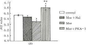 ); P<0.05,P<0.01 compared to control; ## P<0.01 compared to morphine group; AU: absorption unit;Mor:morphine; Nal:naloxone;PKA: protein kinase A inhibitors