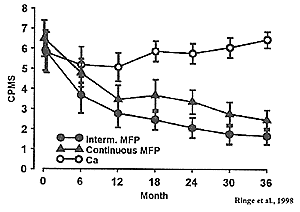 表2列出了副作用的发生情况。3年里,下肢疼痛(LEP)在A组有11人发生,B组有23人,C组没有发生,各组差异有统计学意义。LEP的程度都较轻,在停药3~4周后自行缓解,需要完全停止治疗的只有A组1人和B组1人。